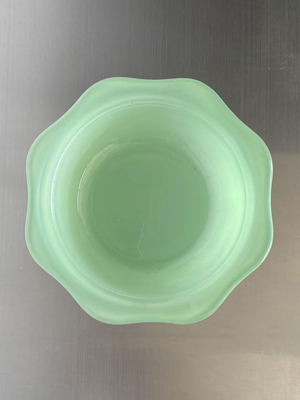 영국에서 생산된 Pyrex 사의 빈티지 유리보울입니다. 산뜻한 에메랄드 빛이 돋보이며 전체적으로 반투명한 질감을 가지고 있어 빛을 은은하게 투과시킵니다. 물결 모양의 테두리가 매력적입니다. 다양하게 활용하기 좋은 크기입니다.