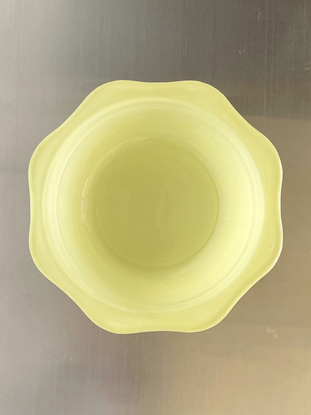 영국에서 생산된 Pyrex 사의 빈티지 유리보울입니다. 밝고 사랑스러운 레몬빛이 돋보이며 전체적으로 반투명한 질감을 가지고 있어 빛을 은은하게 투과시킵니다. 물결 모양의 테두리가 매력적입니다. 다양하게 활용하기 좋은 크기입니다.