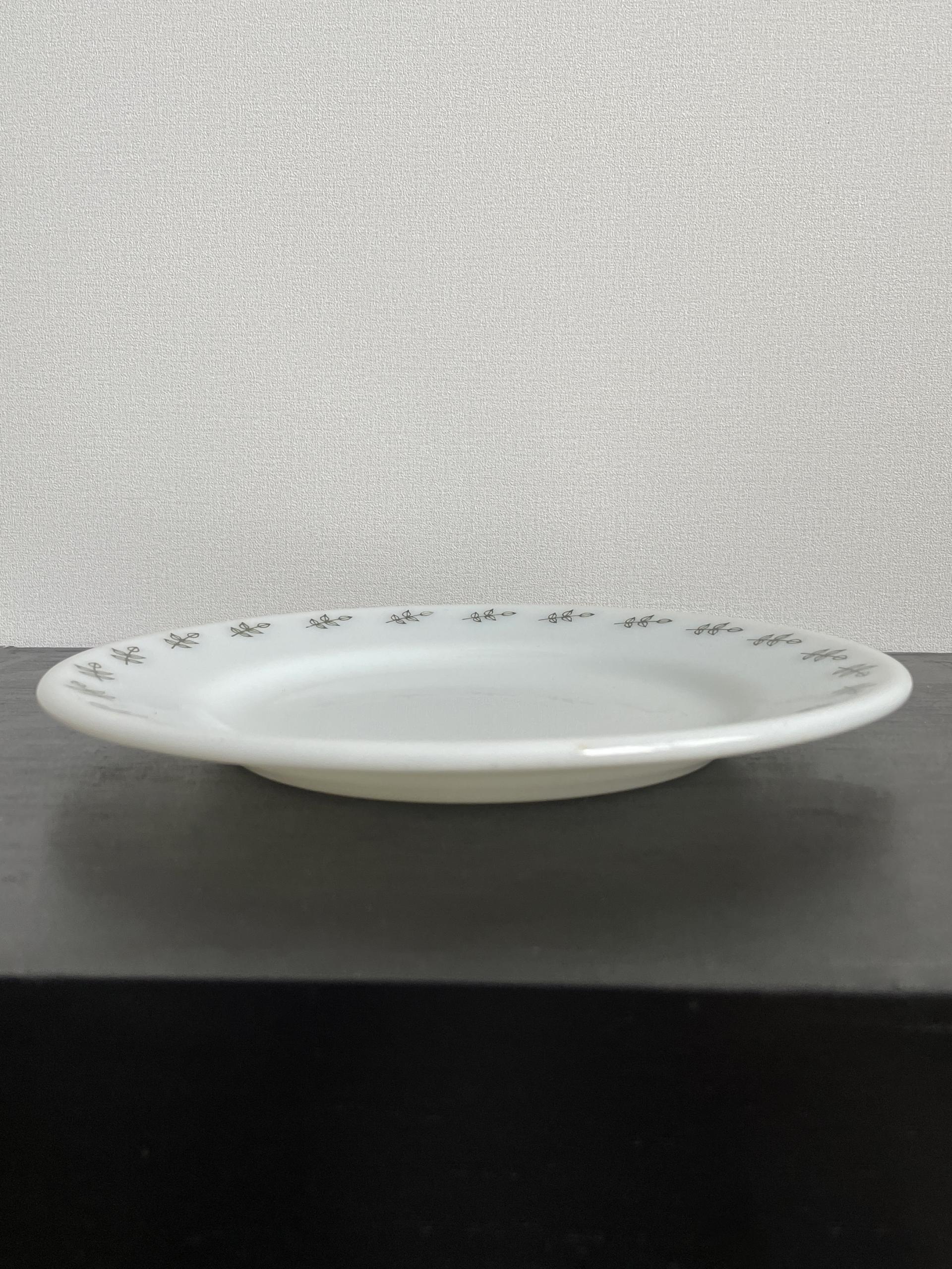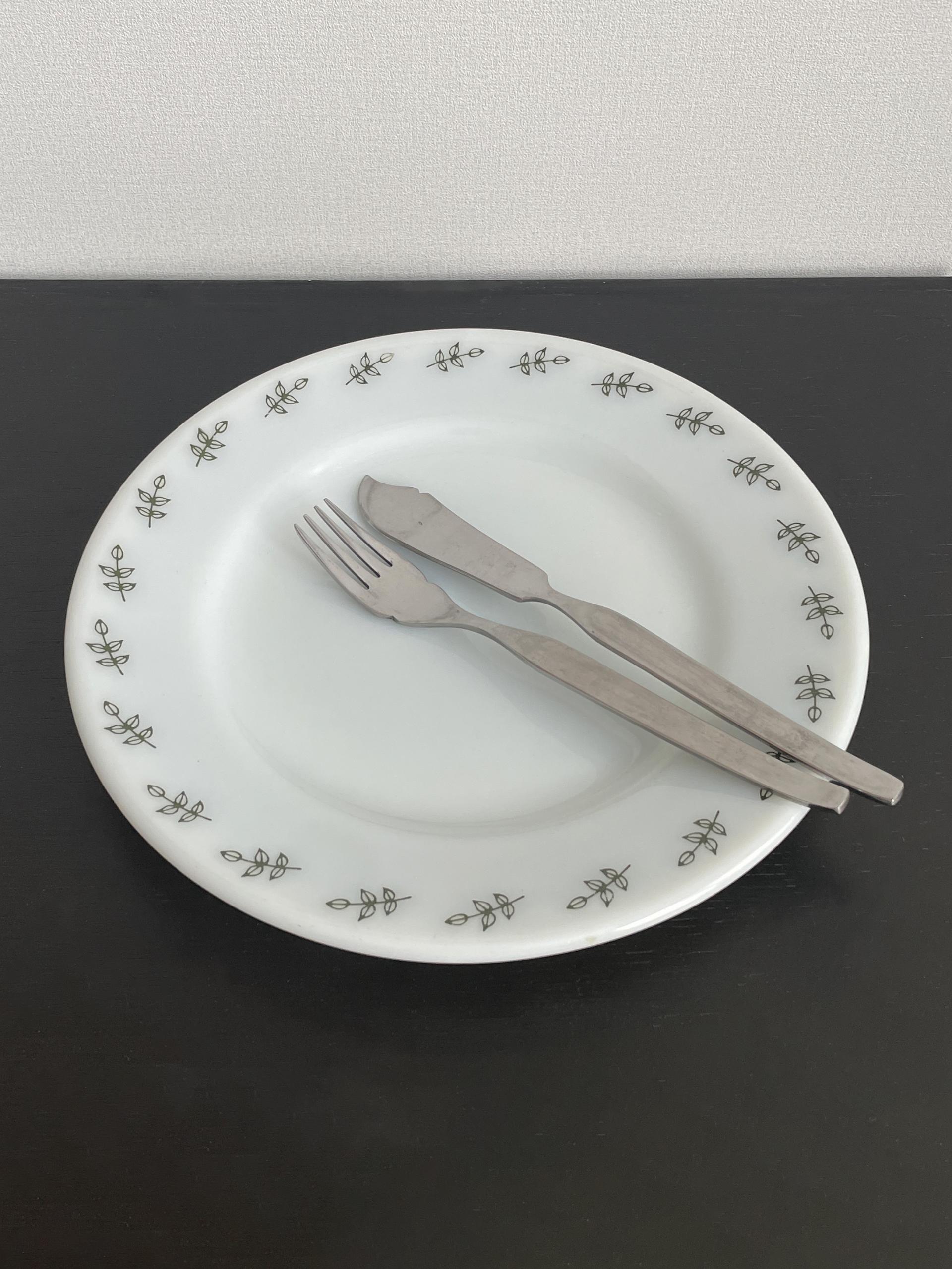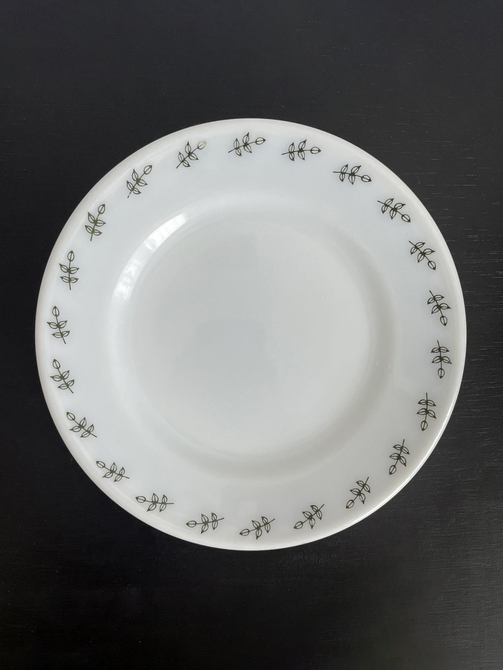 미국 Pyrex Corning 사의 빈티지 런치플레이트 입니다. 맑은 밀크글라스 바탕에 카키색 나뭇잎 모양의 테두리 디자인이 귀여운 플레이트입니다. 표면에 가벼운 사용감이 보이는 컨디션입니다.