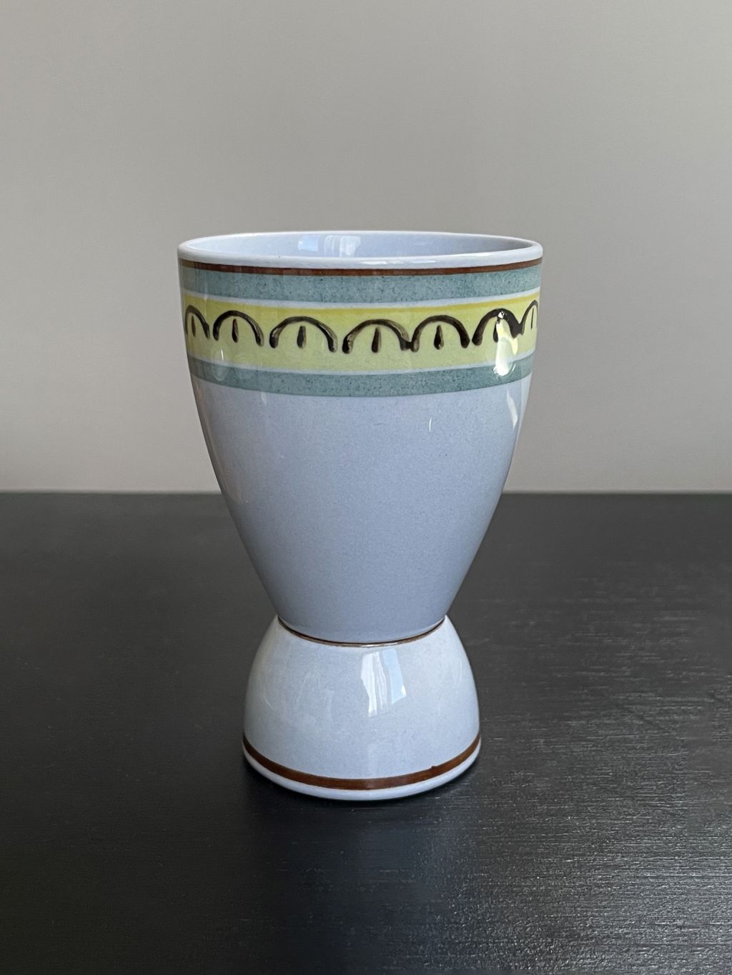 핀란드 Arabia Finland 사의 빈티지 더블 에그 컵입니다. 하늘색이 비치는 연회색 바탕에 수작업으로 그려진 경쾌한 패턴과 산뜻한 레몬빛 색감의 조화가 아름다운 Crown Band 시리즈입니다.