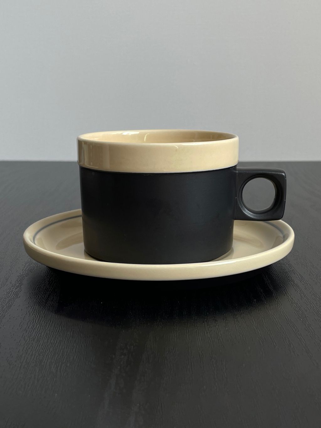 영국 Hornsea 사의 Ebony 시리즈 빈티지 컵&소서 입니다. 매트한 검정색과 부드러운 바닐라색의 두가지 톤의 조화가 매력적입니다. 직선과 원형으로 이루어진 전체적인 디자인은 빈티지하면서 모던한 느낌을 동시에 줍니다.