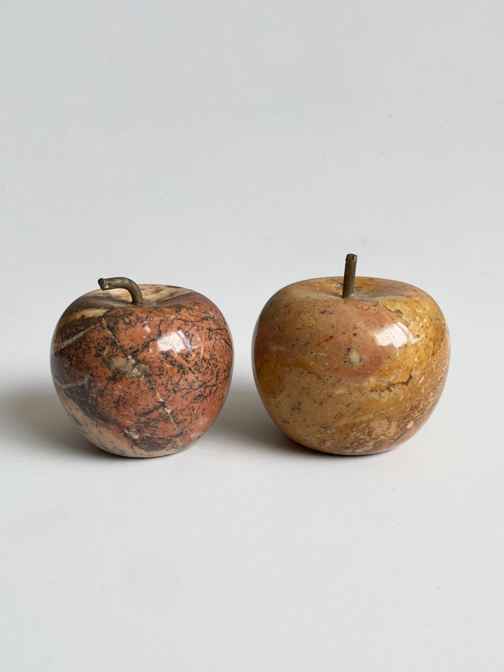 빈티지 사과 모양 문진입니다. 천연 대리석 재질로 만들어졌으며, 재질 특유의 자연스러운 광택과 무늬가 매력적입니다. 너비와 높이가 40-50mm 정도의 크기이며, 문진으로도 공간을 장식하는 오브제로도 활용하기 좋습니다. 사진 속 문진 2개가 1 세트입니다.