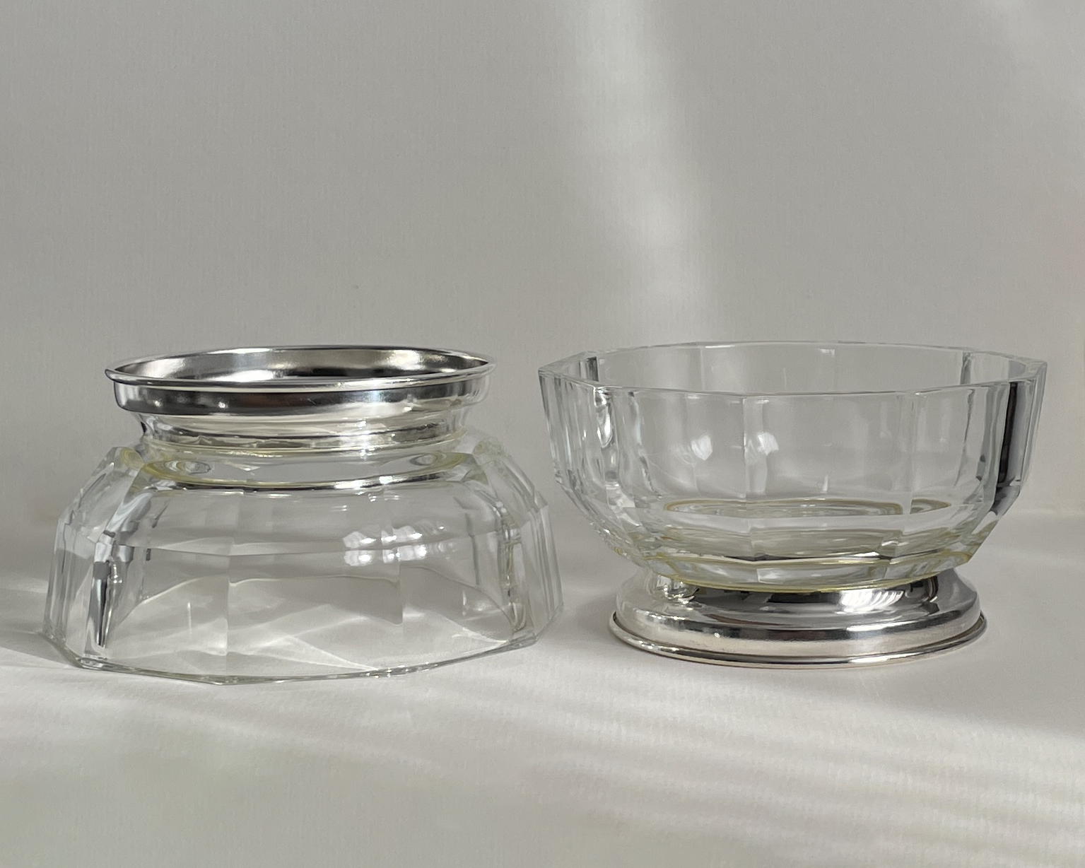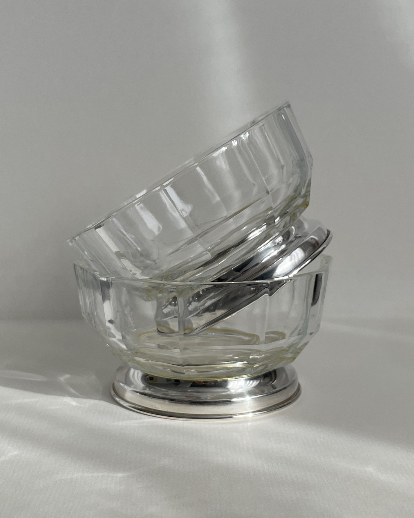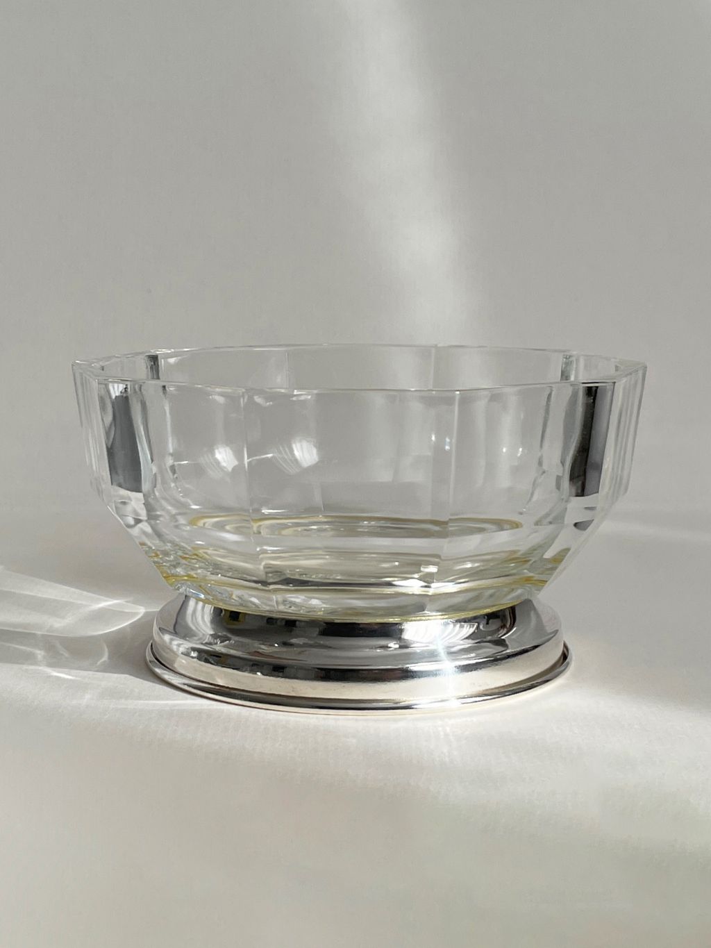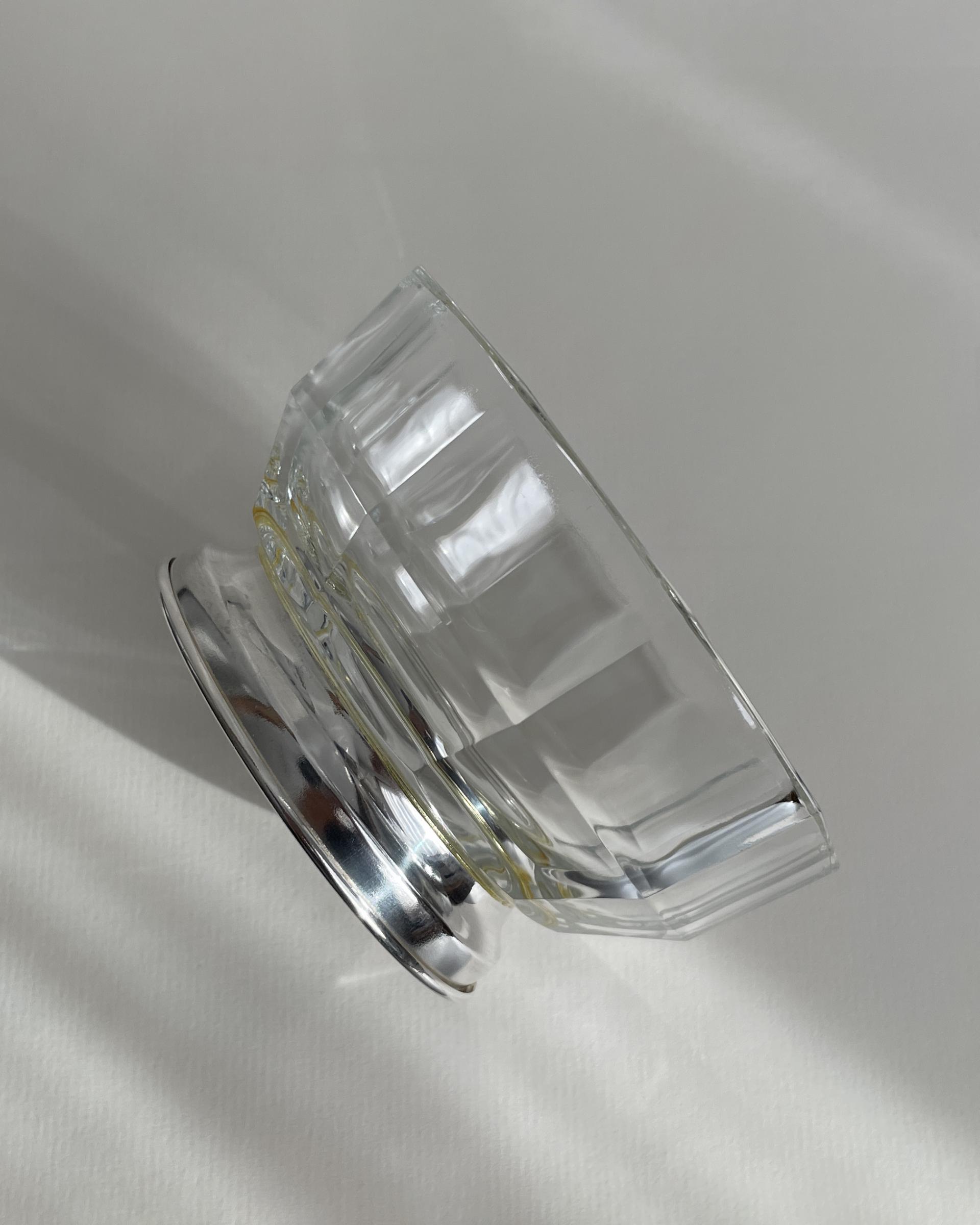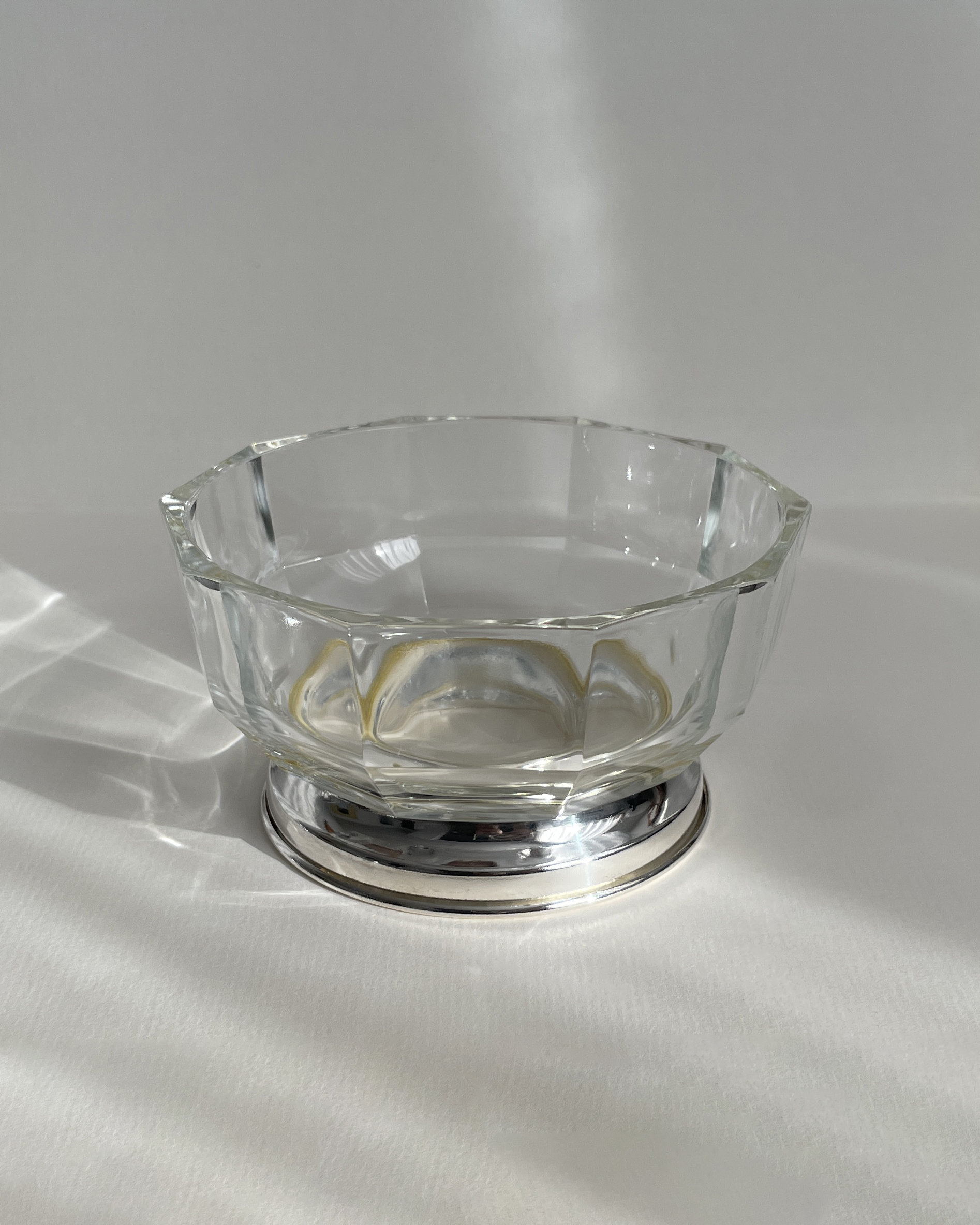 이탈리아에서 생산된 두께감있는 크리스탈 재질의 빈티지 디저트 보울입니다. 다각형의 투명한 크리스탈 유리는 빛을 받으면 아름답게 반사됩니다. 클래식함을 더해주는 은도금 베이스가 매력적입니다.