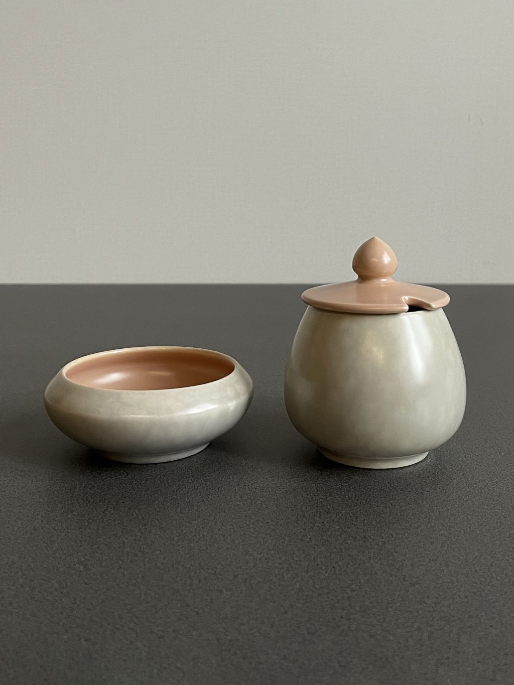 영국 Poole Pottery 사의 Twintone - Seagull & Peach 시리즈 빈티지 소금후추 보관통입니다. 부드러운 회백색의 외관과 은은한 복숭아빛 내부의 조화가 매력적입니다.
