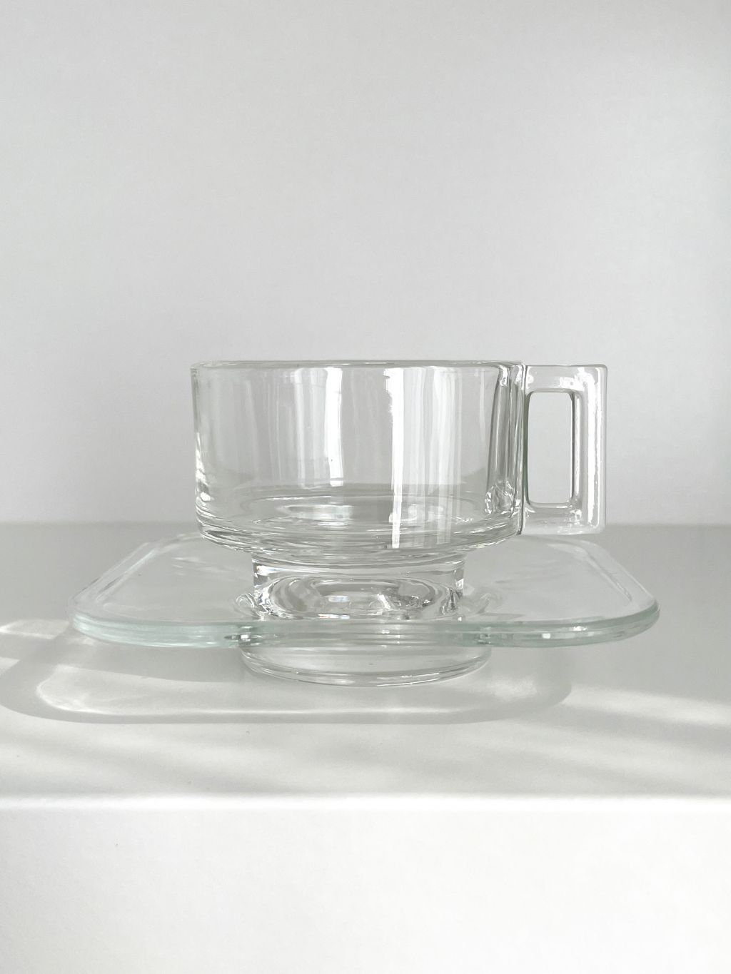 20세기 중후반 이탈리아의 산업디자이너 Joe Colombo 의 Arno 시리즈 빈티지 에스프레소 잔과 소서입니다 :) 빛에 따라 은은한 반사가 생기는 맑은 유리 재질과 직선형태의 손잡이가 실용적이며 디자인적 요소를 모두 갖추고 있습니다.