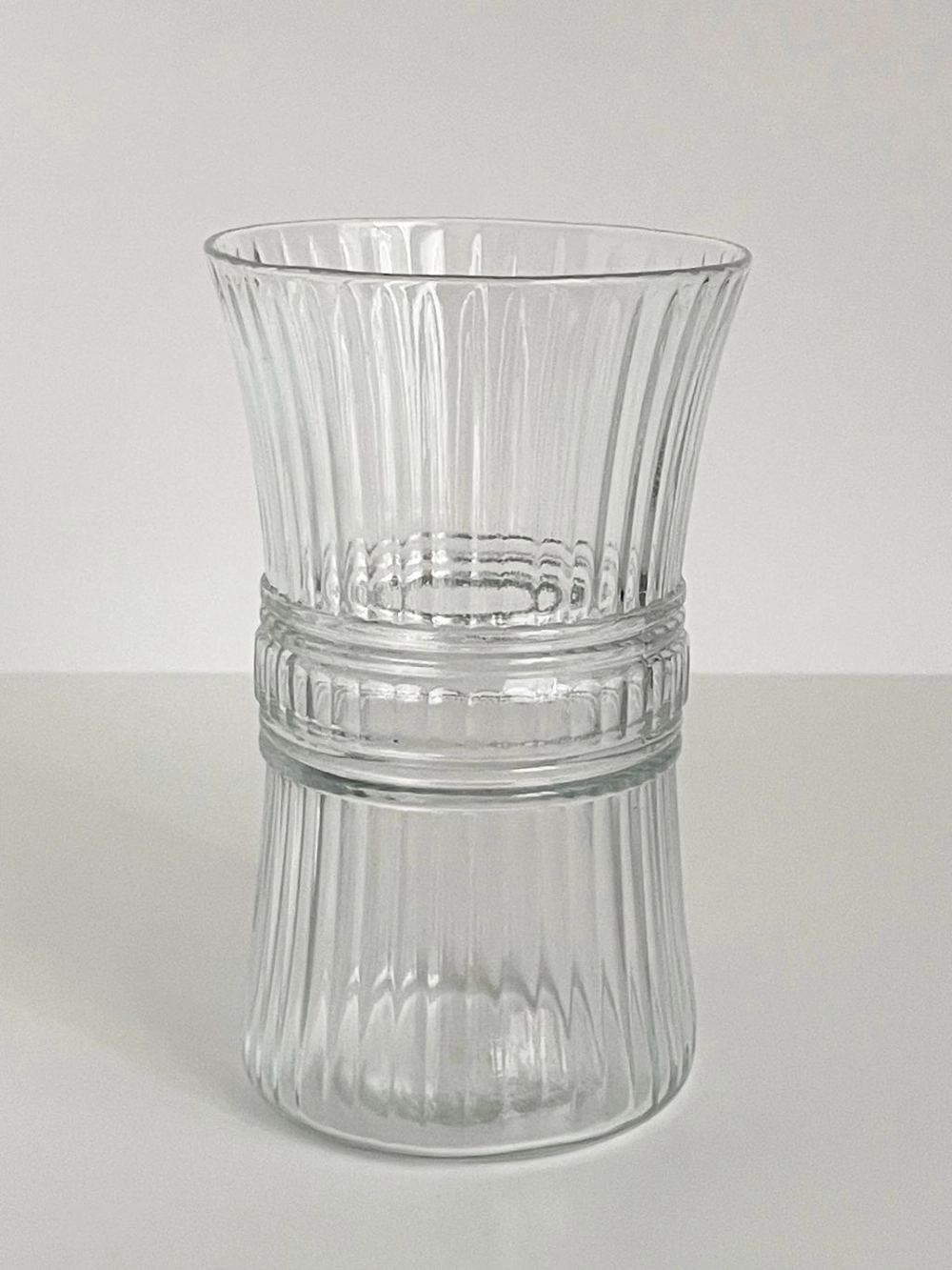 전체적으로 입체감이 있는 세로 줄무늬 패턴과 중앙에 띠처럼 둘러져 있는 디테일이 매력적인 빈티지 잔입니다. 소량의 꽃을 꽂아두는 화병으로 활용하기에도 좋은 크기입니다.