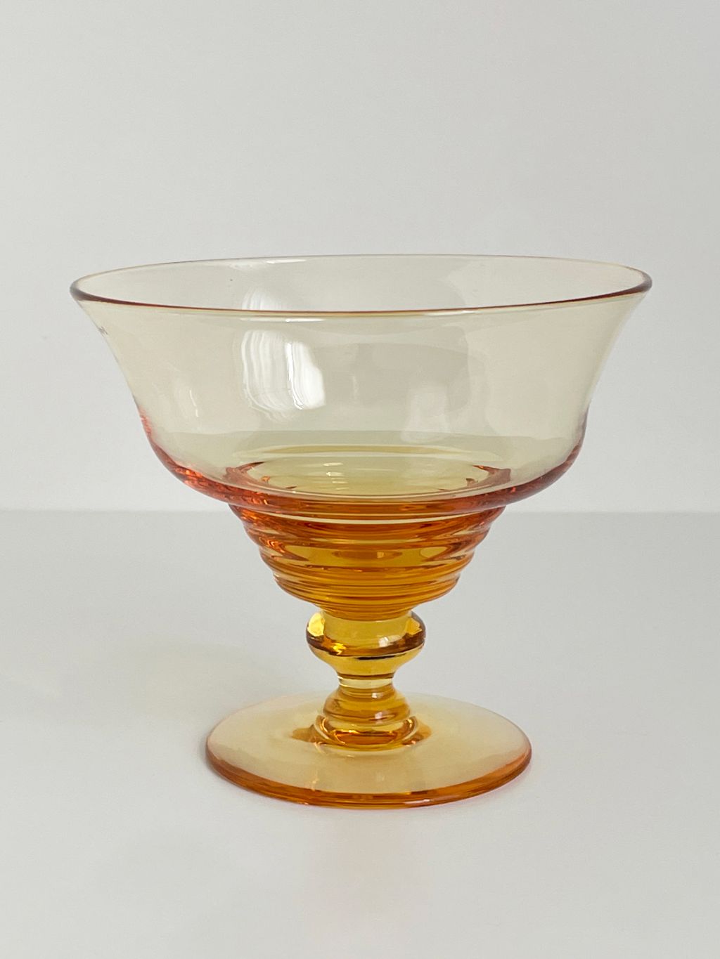 영국 Stuart Crystal 사의 빈티지 크리스탈 샴페인 쿠페입니다. 전체적으로 앰버컬러의 따뜻한 색감을 가지고 있으며 층층이 겹쳐지는 입체감있는 손잡이가 매력적입니다.