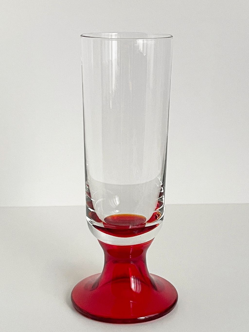 입구에서 하단까지 일직선으로 떨어지는 심플한 형태의 투명한 잔의 빈티지 글라스입니다. 아래로 둥글게 퍼지는 짙고 선명한 붉은색의 유리 손잡이가 매력적입니다.