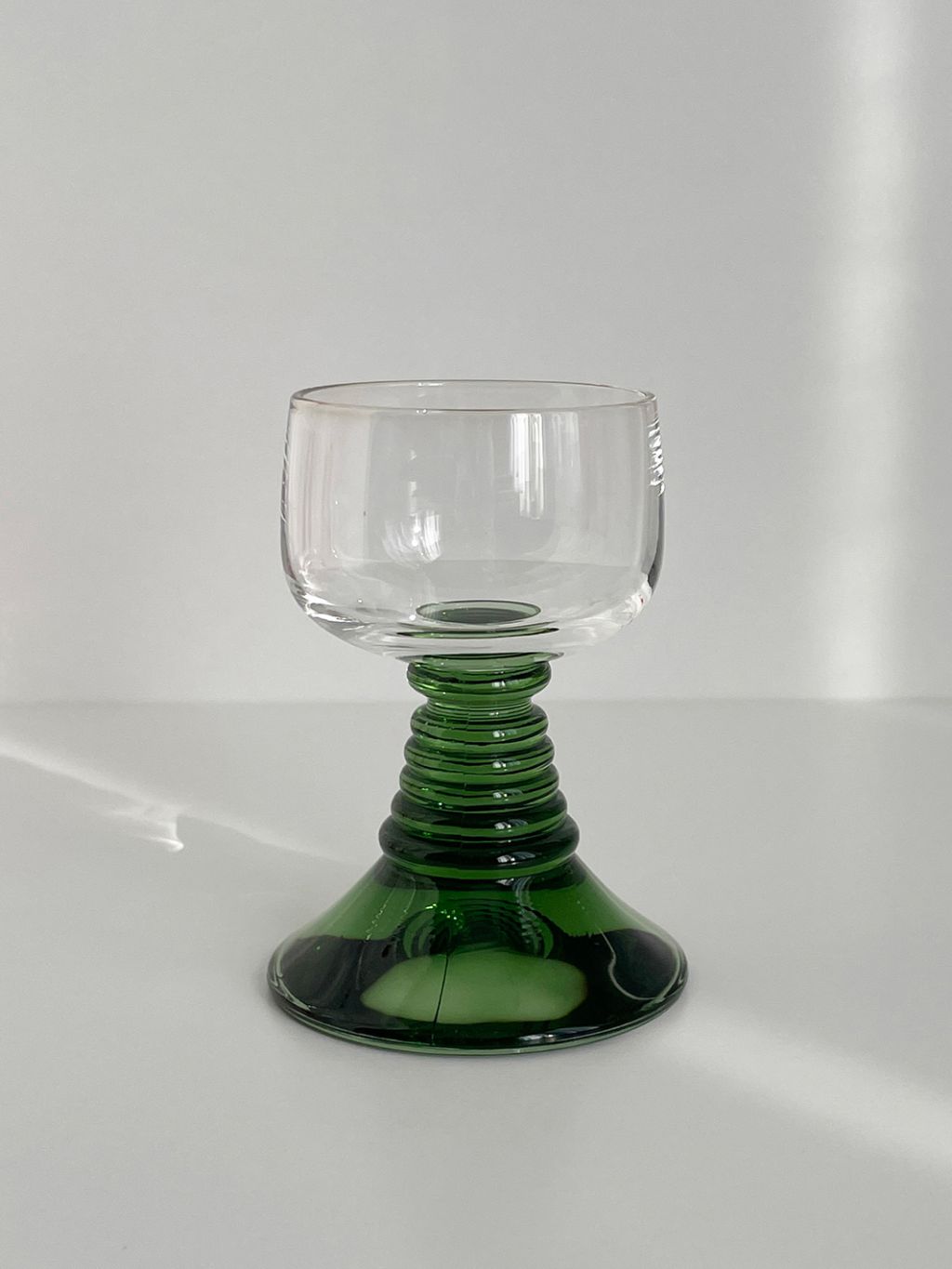 짙은 초록빛과 독특한 구조의 손잡이가 매력적인 빈티지 샷글라스입니다, Roemer 글라스는 짧고 둥근 잔의 형태와 나선형 구조의 손잡이가 특징입니다.