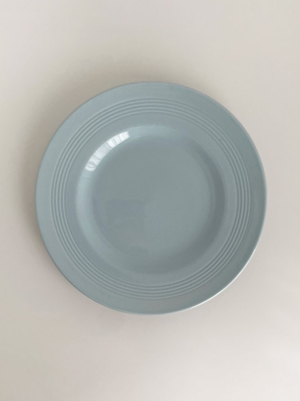 영국 Wood's Ware 사 Iris 시리즈의 빈티지 디저트 플레이트입니다. 단정한 테두리 디자인과 채도가 낮은 하늘색의 차분한 색감이 아름답습니다.