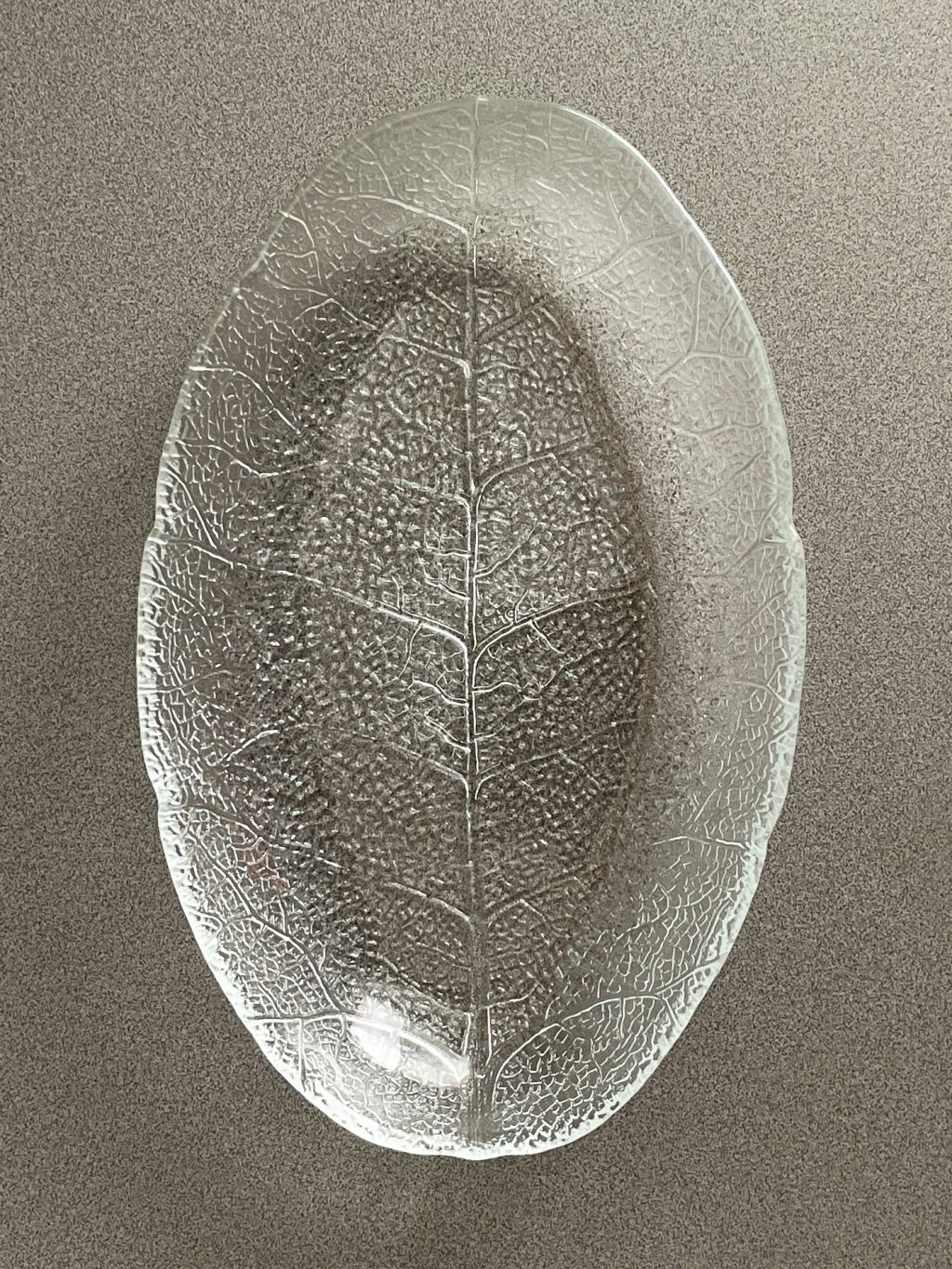 프랑스 Arcoroc 사의 빈티지 글라스 플레이트입니다. 섬세한 나뭇잎 결이 입체적으로 새겨져있어 자연스러운 질감이 아름답습니다.