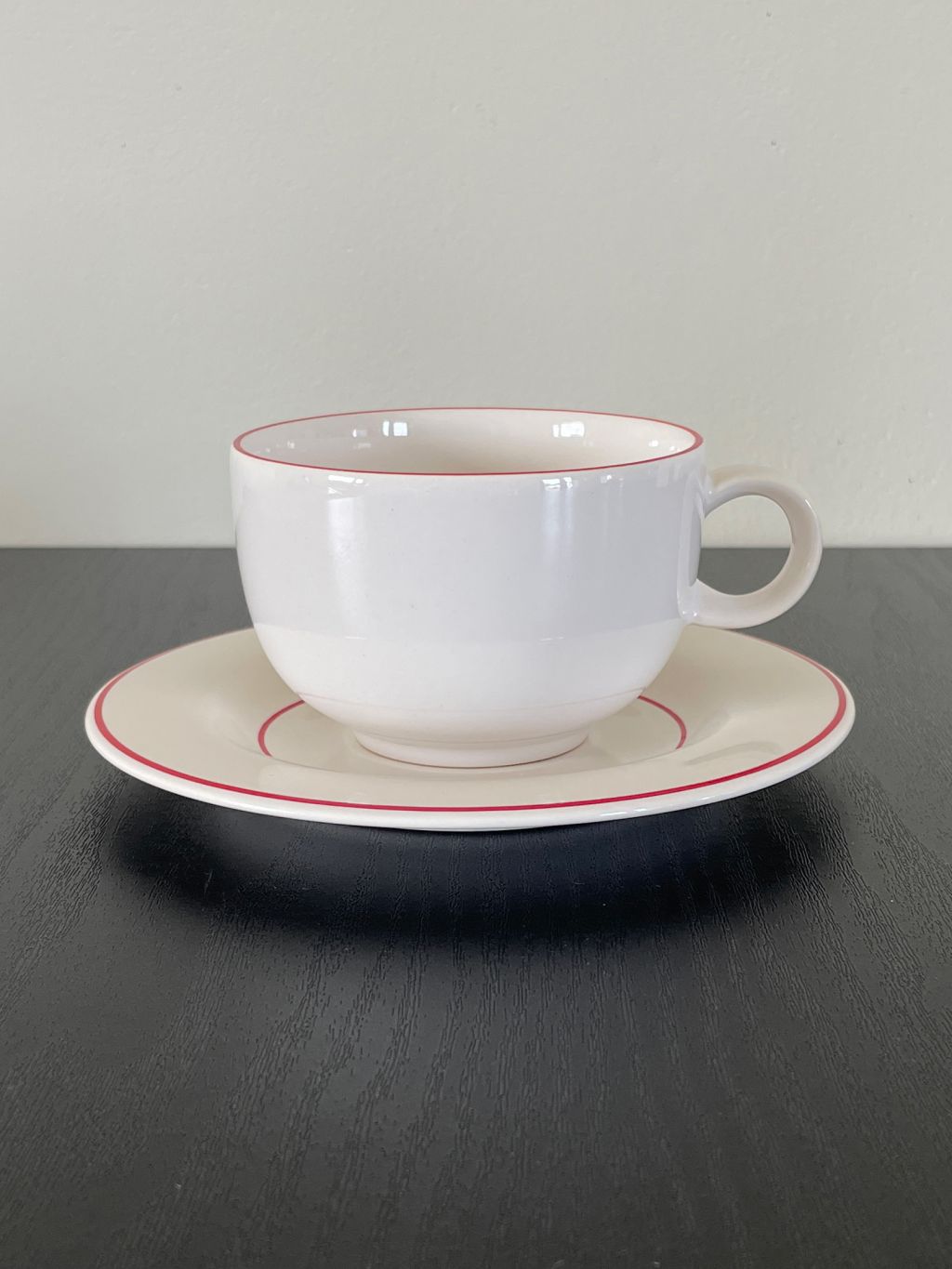 영국 Hornsea 사의 빈티지 컵&소서 입니다. 동그란 형태의 귀여운 손잡이에 단정한 붉은색 테두리가 매력적입니다.