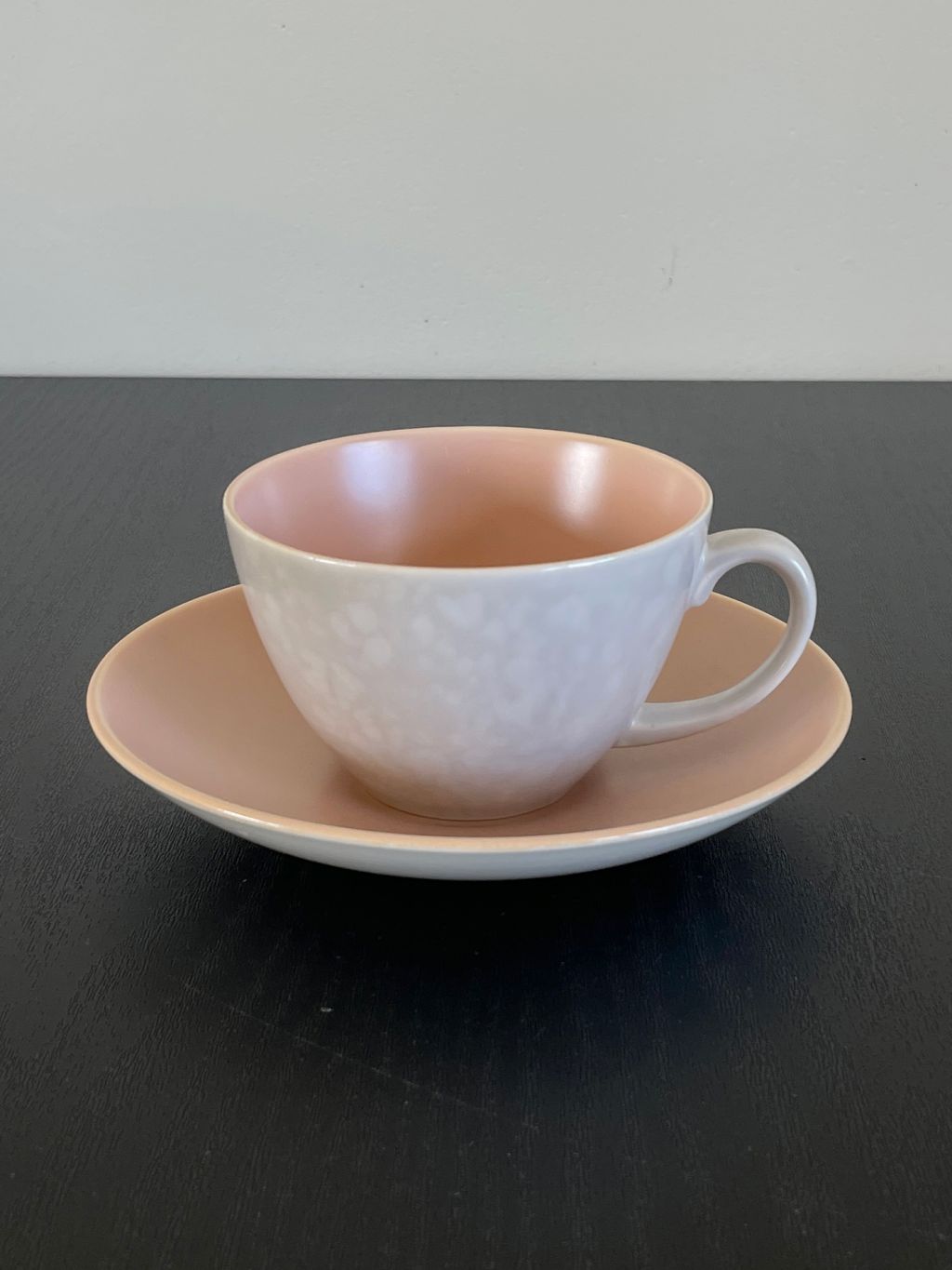 영국 Poole Pottery 사의 Twintone - Seagull & Peach 시리즈 빈티지 컵과 소서입니다. 부드러운 회백색의 외관과 은은한 복숭아빛 내부의 조화가 매력적입니다.
