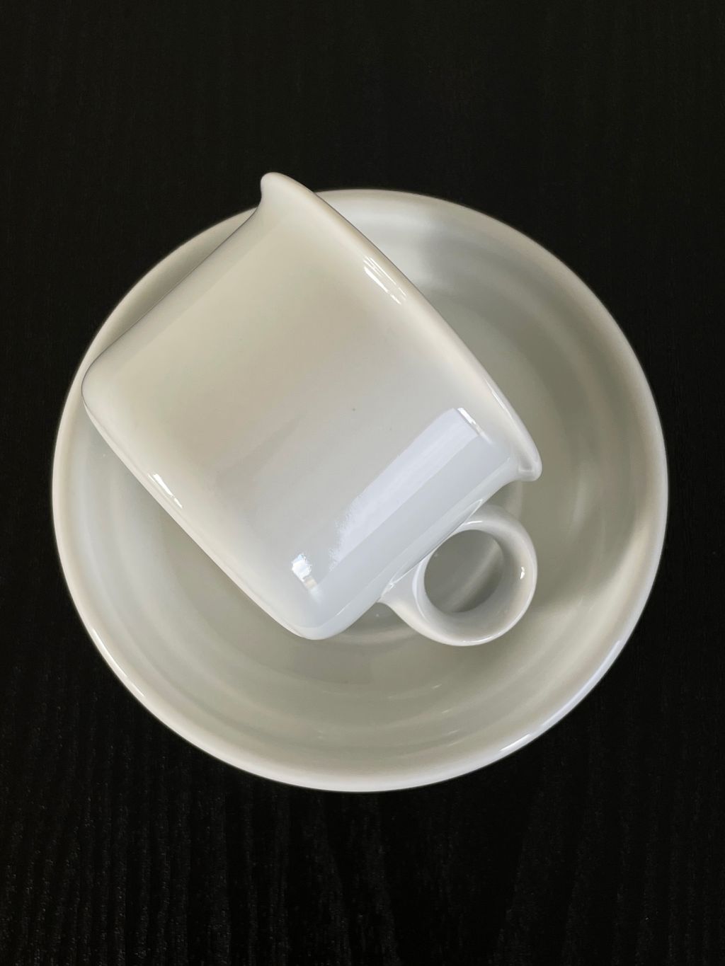 덴마크 Dansk 사의 Eslau 시리즈 빈티지 컵과 소서입니다. 깨끗한 백색바탕에, 입술이 닿는 가장자리의 형태와 동그란 손잡이가 매력적입니다.