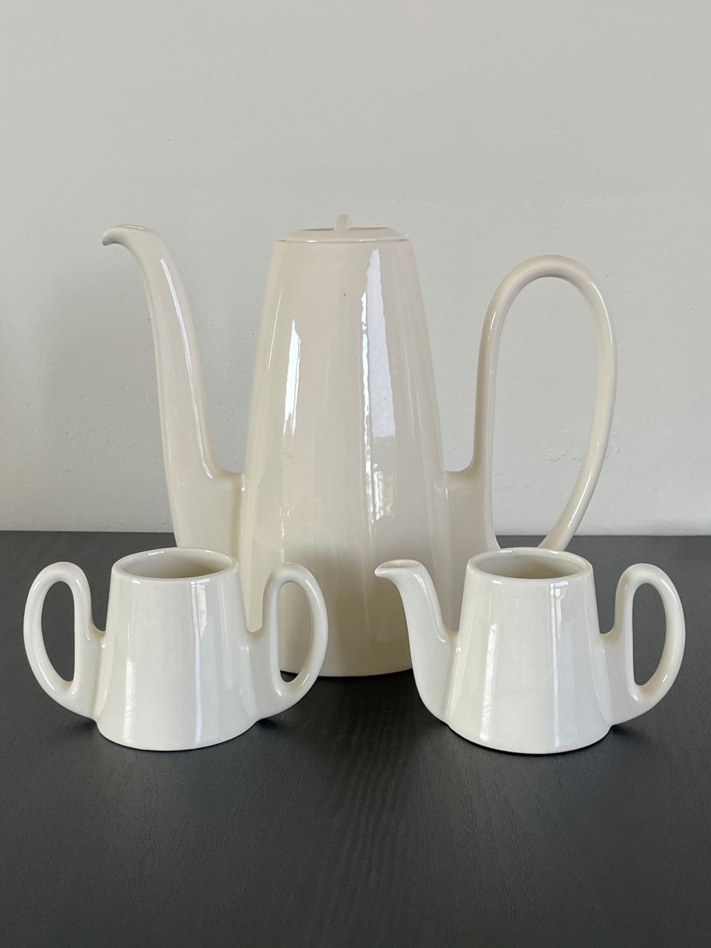 독일 WMF 사에서 1950-1960년대 디자인되고 생산된 것으로 추정되는 Ikora 시리즈의 빈티지 커피세트입니다. 독일 특유의 구조적인 디자인과 아름다운 곡선의 조형미가 매력적입니다. 표면은 매끄러운 광택이 있는 따뜻한 아이보리 컬러입니다. 커피포트, 크리머, 슈가볼이 한 세트입니다.