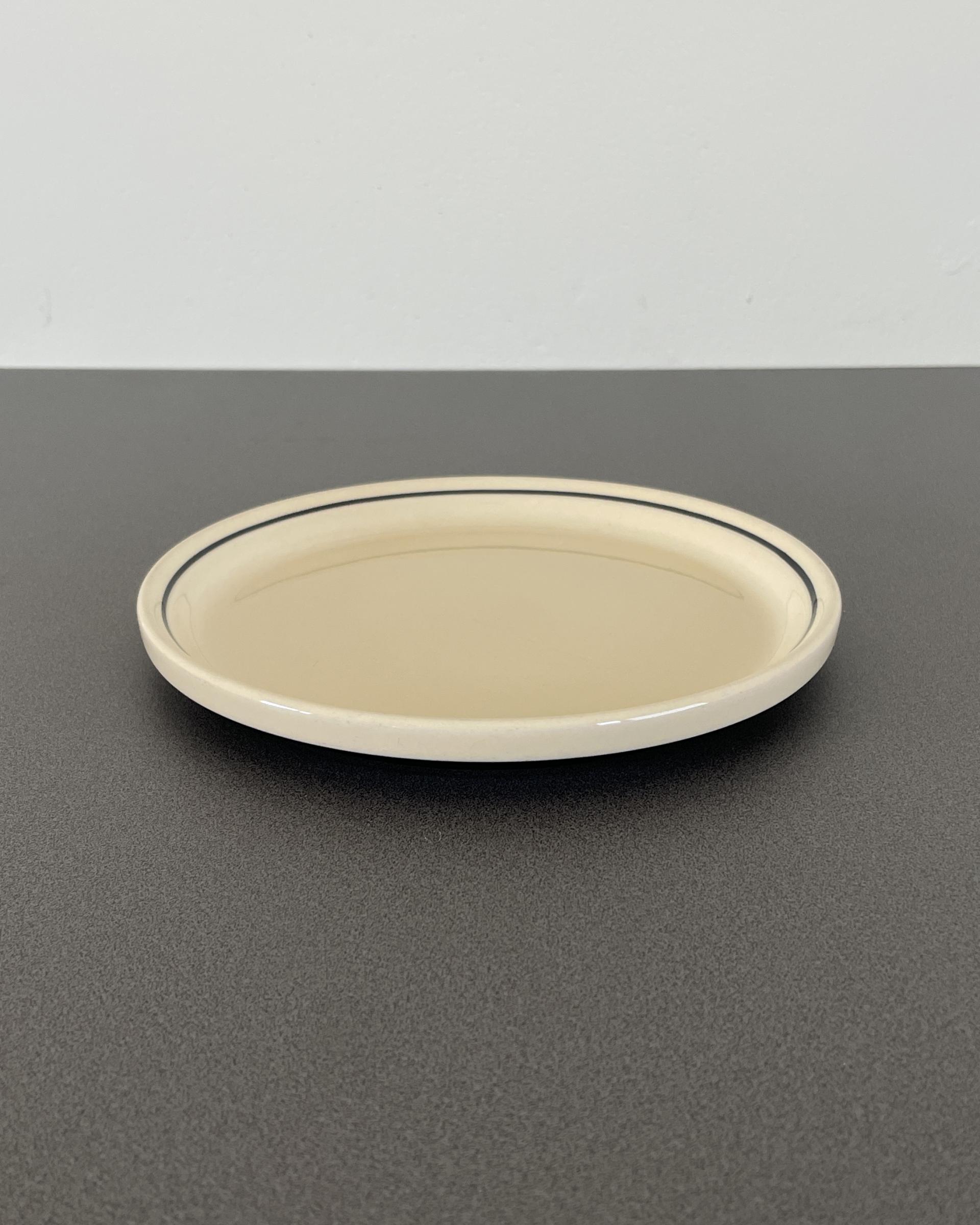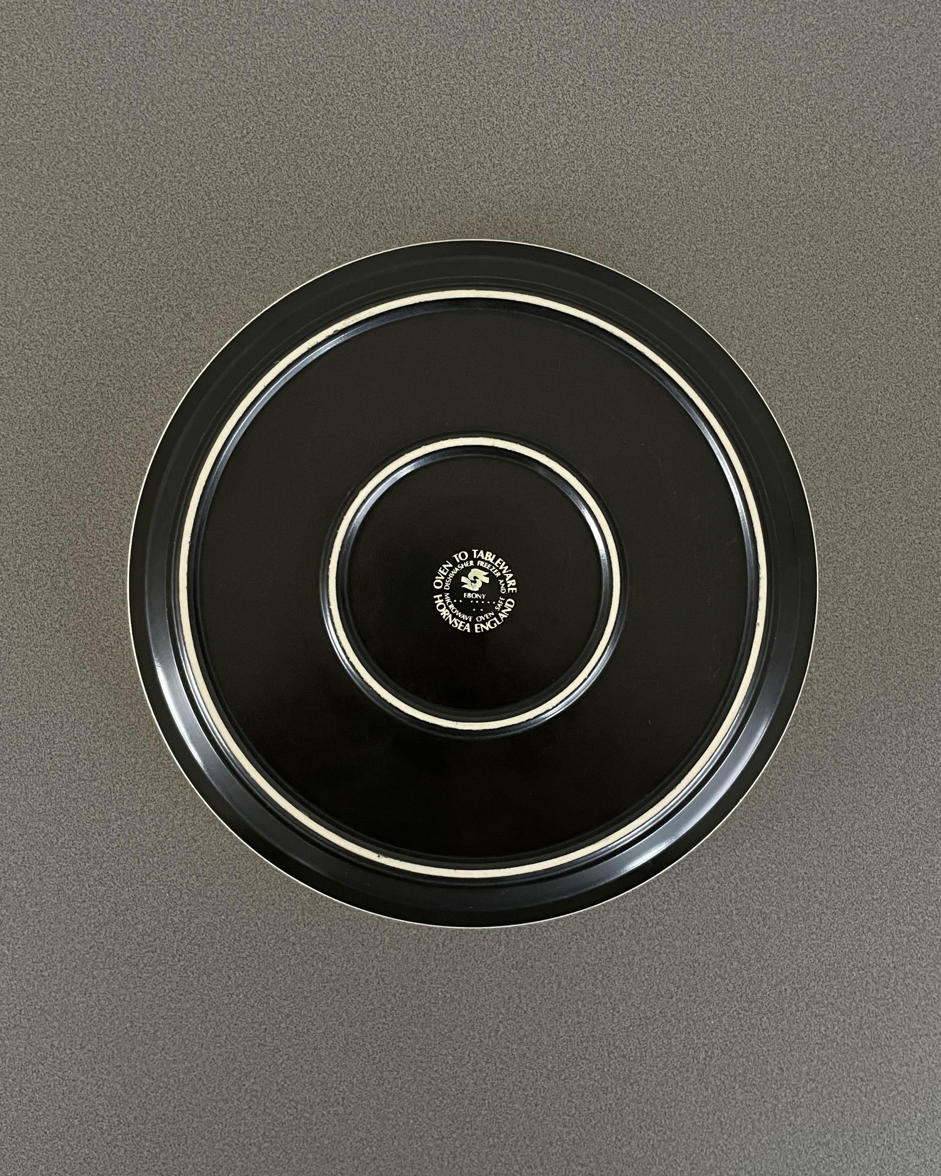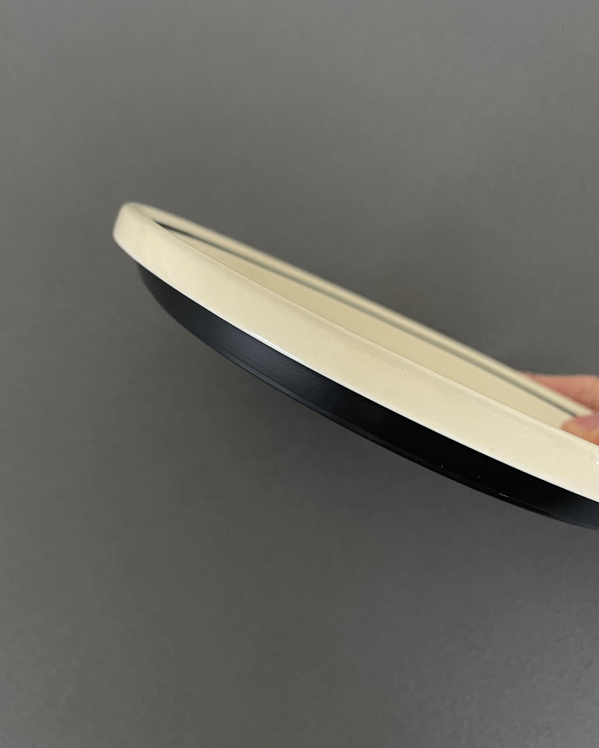 영국 Hornsea 사의 Ebony 시리즈 빈티지 사이드 플레이트 입니다. 부드러운 바닐라 톤과 매트한 블랙 톤이 대비되며, 두 색감의 단정한 조화가 돋보이는 디자인입니다. 접시의 윤곽을 또렷하게 만들어주는 검정색 얇은 테두리가 매력적입니다.